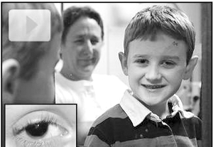7岁的纳撒尼尔·布兰特雷家住美国俄亥俄州辛辛那提市郊,患有一种发病率仅为10万分之一的罕见怪病——先天性无虹膜症。对于正常人而言,日间光线较为强烈时,虹膜会收蹜,只使一小束光线穿透瞳孔,进入眼睛;当进入黑暗环境中,虹膜就会往后退缩,使瞳孔变大,让更多的光线进入眼睛。然而由于先天缺失虹膜,纳撒尼尔的瞳孔无法收缩,导致过多的光线进入眼球,由此造成视力低下、青光眼、眼球震颤等多种眼科疾病。