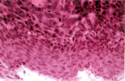 上皮细胞增生排列较紊乱,但也有上皮细胞规则地排列成栅状或环状。细胞大小不太一致,染色深,有丝分裂多见。
