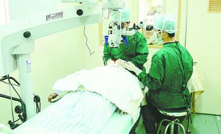 2008年12月8日至19日,中国流动手术车“复明18号”开进马山县,在该县人民医院为200名贫困家庭老年白内障患者实施免费复明手术。此次复明行动是由自治区残联和亚洲防盲基金、香港盲人辅导会联合开展的。图为广西医科大附院眼科专家在流动手术车上实施手术。