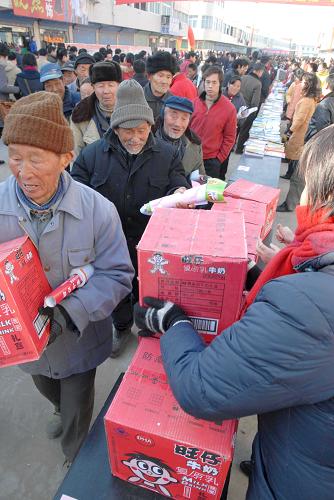 1月13日,五保老人领取淮南市民政部门发放的慰问品。当日,安徽淮南举行文化、科技、卫生“三下乡”活动,在新春佳节来临之际将知识和健康送到农民家门口,受到农民群众欢迎。新华社发(陈彬 摄)