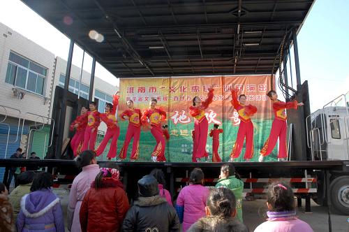 1月13日,淮南市歌舞团演员在流动舞台车上为群众表演舞蹈。新华社发(陈彬 摄)