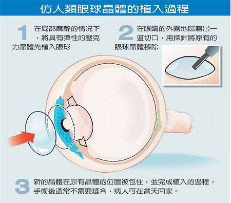 目前也有其它种人工制成的塑料眼球晶体在临床上使用,不过因弹性不足,只能解决近视或远视其中一种毛病,更谈不上根治老花眼。