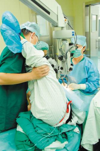 考虑到病人身体的特殊情况,手术中,医生只能始终扛着她的双腿,并将臀部抬起,才能实施。但是由于拆除白内障是十分精密的手术,全过程都要在显微镜下进行,负责扛腿的医生只要使患者身体有一丝抖动,不仅会使手术失败,还可能造成眼球破损,导致终身失明。为此,他们特意安排了多名身体强壮的医生,轮流扛着患者腿部。