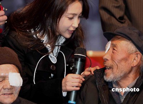 中国演艺明星李冰冰,1月28日在陕西省蒲城慰问刚刚通过慈善手术复明的贫困农民白内障患者。当日揭牌的“陕西蒲城‘亮睛’扶贫眼科中心”,是由香港医学界热心人士发起、在香港注册成立的“亮睛工程慈善基金”实施的“亮睛工程”的一部分,该工程计划未来五年在中国人口多的贫困地区设立100个扶贫眼科中心(亮睛点),每个中心每年实施1000例白内障手术,大力协助中国的扶贫除盲重任。中新社发 任晨鸣 摄
