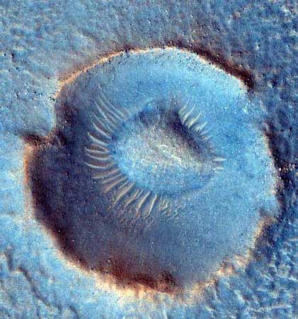 北京时间1月30日消息,据美国宇航局太空网29日报道,火星勘测轨道器拍到的一张陨石坑的照片,看上去像一只一眨不眨的蓝色眼睛。