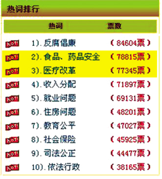 本次调查涉及环境保护、医疗改革、反腐倡廉、安全生产、灾后重建、住房问题、食品药品安全、教育公平等20个候选项和百余个具体问题。从投票结果看,食品药品安全以78,815票列网友最关注的两会热点问题第2位,医疗改革选项紧随食品药品安全选项,以77,345票位列第3。