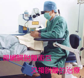 治疗:1998年9月15日在局麻下行右眼玻璃体切割、剥膜、注重水展平视网膜,裂孔眼内激光封闭、变性区冷凝处理,气-重水置换,注硅油后行巩膜环扎术。