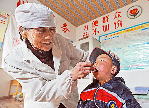 宁夏固原市开城镇三十里铺村村医马淑义在为患者看病(3月24日摄)。宁夏2009年正式启动“人人享有基本医疗卫生服务”试点,银川市、固原市农民到村卫生室治疗常见病每次只需支付1元药事费。试点地区村卫生室按成本价提供30种一般性疾病诊疗和74种药品,并实行“一户一证、就近看病、价廉用药、每次一元”。 新华社记者 王鹏摄