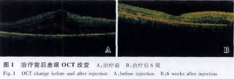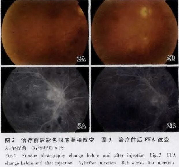 2 . 3 F F A 检查术后6 周行F F A 检查显示半数以上的患者黄斑区渗漏明显减少或消失, 并且疗效可以保持至术后1 2周。治疗后未发现眼压异常改变, 裂隙灯检查未见前节炎症反应, 未发现白内障加重。随访中未见眼压异常改变和白内障的进展, 未见与药物有关的眼部和全身不良反应( 图2 , 3 ) 。