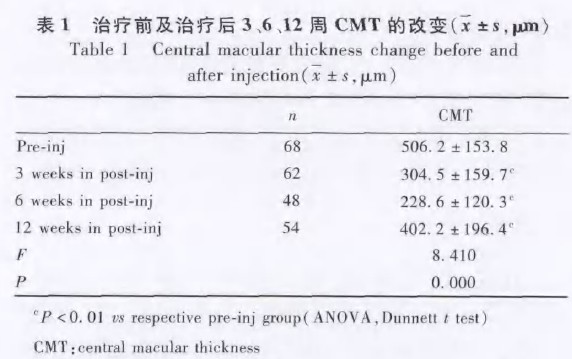 2 . 2 C M T 变化术后3 周时C M T 平均值与术前比较差异有统计学意义( 1= : 3 . 4 5 , P = 0 . 0 0 4 ) , 术后6 周时与术前比较差异有统计学意义( t = 3 . 1 8 , P = 0 . 0 0 7 ) , 术后1 2 周与术前比较差异有统计学意义( t = 3 . 4 6 ,P = 0 . 0 0 4 ) ( 表1 ) 。末次随诊, C M T 平均为( 3 7 9 . 1 ± 1 6 6 . 3 ) tx m 。在药物注射后6 周时达到最佳治疗效果( 图1 ) 。