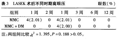 局部长期滴用糖皮质激素最容易出现的并发症是眼压增高。MMC组中眼压增高者8眼(4.02%),其中有6眼(3.01%)术前眼压就接近20 mmHg(1 mmHg= 0.133 kPa);MMC联合DM组中眼压增高者4眼(2.00%),其中有2眼(1.00%)术前眼压亦接近2mmHg(表3)。