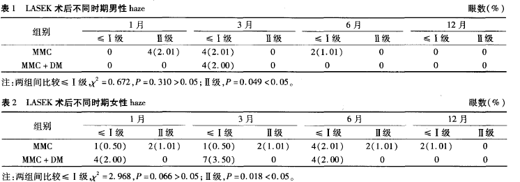 在男性及女性中两组Ⅱ级haze发生率比较,差异均有统计学意义(男:P=0.049<0.05;女:P=0.018<0.05);两组≤I级haze发生率的比较,均无统计学差异(男:X2=0.672,P=0.310>0.05;女: =2.968, P:0.066>0.05)。经治疗≤ I级haze均在1周内治愈,Ⅱ级haze均在2周内治愈,无其他并发症出现。