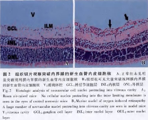 正常组中未见明显突破视网膜内界膜的新生血管内皮细胞核;而模型组均可见突出内界膜的血管内皮细胞核, 发生率为1 0 0 % 。模型组突破视网膜内界膜的新生血管内皮细胞核均数为1 7 . 2 - 4 - 2 , 6 ( 图2 ) 。