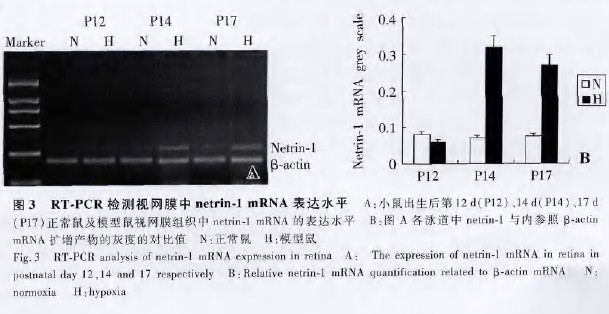 VEGF的缓释颗粒植入距角膜缘1 mm 的角膜层间,发现由缓释颗粒释放的Netrin.1能诱导角膜新生血管的 发生,且其诱导角膜新生血管的能力与VEGF相当 。由此可见,外源性Netrin一1能够通过促进内皮细胞的增生与迁移,直接诱导新生血管的形成,或者在缺血、缺氧等病理刺激下与内源性促血管生成因子如VEGF等相互协同来加速新生血管的发生。基于此我们采用高氧诱导的视网膜新生血管模型鼠来研究内源性的Netrin一1对视网膜新生血管形成的调控作用。高氧诱导的视网膜新生血管小鼠模型是1994年由Smith等 提供的一种完善的建立视网膜新生血管动物模型的方法。此模型方法简便易行,重复性好,新生血管的发生率为100% ,目前已经成为研究视网膜新生血管最常用的动物模型之一。高氧诱导的视网膜新生血管模型是利用出生后第7 d的小鼠视网膜血管尚未发育成熟,持续5 d的高氧后,由于机体对高氧的保护性反应,视网膜血管普遍收缩,继而视网膜血管广泛闭塞,移入正常空气中后,闭塞的血管不能适应视网膜组织对氧的需求,视网膜内层组织出现持续的缺血、缺氧,位于视网膜内层的视网膜神经节细胞及内核层视网膜细胞在缺血、缺氧等病理刺激下合成并释放多种促血管生成物质 ,如VEGF 、促红细胞生成素(erythropoietin,EPO) 等,从而促进视网膜新生血管的形成。本研究结果表明新生鼠出生12 d时,模型鼠视网膜组织中Netrin一1 mRNA表达水平与正常对照鼠比较差异无统计学意义。新生鼠出生14 d时,出氧舱后2 d的模型组鼠视网膜组织中Netrin一1 mRNA 表达水平较对照组明显上调。新生鼠出生17 d时,出氧仓后5 d的模型鼠此时视网膜新生血管形成数目最 多,模型鼠视网膜组织中Netrin一1 mRNA表达水平仍高于对照鼠,但较出生14 d时Netrin—l mRNA表达水 平已有所下降。我们推断模型鼠视网膜新生血管发生过程中,持续缺氧的视网膜组织可能从转录水平增加 Netrin一1的表达,从而诱导视网膜新生血管的发生。综上所述,模型鼠视网膜新生血管发生过程中,视网膜组织通过增加Netrin一1的转录从而上调Netrin一1 mRNA表达水平。但是视网膜新生血管的形成过程 中Netrin I蛋白的表达变化趋势是否与mRNA变化趋势相一致,缺血、缺氧的视网膜组织是通过何种途径来 增加Netrin一1的转录以及Netrin-1是通过哪种受体及信号途径来促进视网膜新生血管形成,仍有待于进一步的研究。