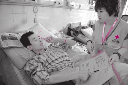 躺在病床上的吴伦彬五官清秀,很瘦,腹部插了好几根管子,管子里不断从体内导出脓液。据医生说,吴伦彬的病已到了晚期,最多还能活半年时间。尽管如此,看到省红十字会和成都康桥眼科医院的专家到来后,他仍打起精神,眼里闪着光。在两名志愿者的帮助下,吴伦彬在捐献角膜的申请书上签了名。