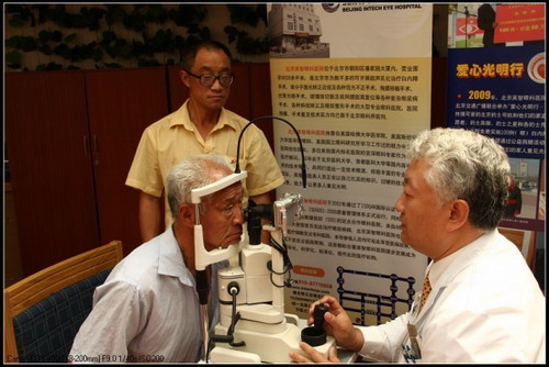 这位大妈已81岁高龄,在活动现场进行术后检查术,她的儿子就是一名的士之星,院长先出场进行白内障筛查