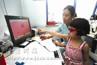 北京儿童医院眼科近日为弱视的孩子量身定做网络弱视治疗方案,孩子通过认别电脑屏幕上的图案完成治疗。这种治疗更有针对性,超过12岁以上的大龄孩子也能得到良好的治疗。图为儿童医院眼科的医护人员正在为一位弱视的孩子用电脑上的立体图片检查视力。