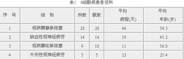 视野扩大5°为1级。序号2~4的疗效标准为,显效:视力增进3行以上或三级以上,视野扩大10°或以上;有效:视力增进2~3行或2~3级,视野扩大≥5°。无效:未达到有效标准者。对视力提高属显效范围,但视野扩大小于10°或无明显扩大者归有效病例。序号1的疗效标准除视力判断同前外,并观察眼底出血、渗出、水肿及FFA的RCT等4项,治疗后视力显效加眼底≥3项指标减轻者为显效,视力有效加眼底1~2项指标减轻者属有效。