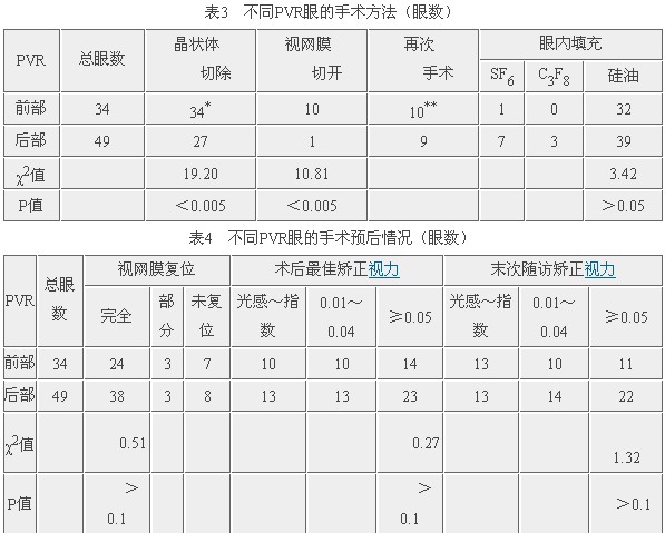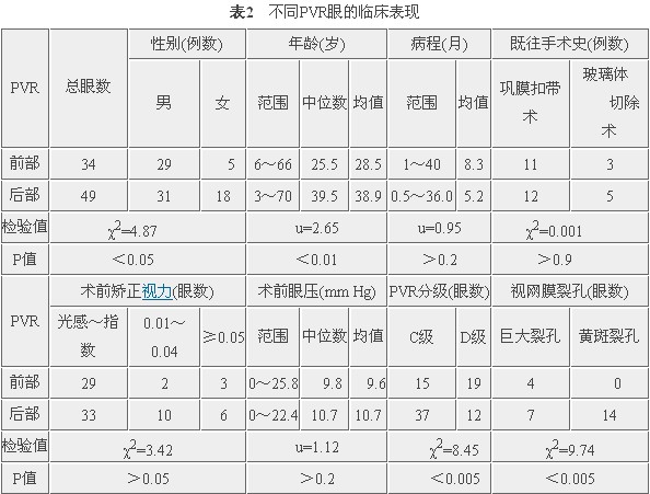 1.前部PVR眼术中100%摘除晶状体,后部PVR眼为55.1%(χ2=19.20,P<0.005)。