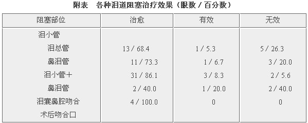 随访观察6~28个月,结果见附表。其中11只眼分别在2周~3个月内重新阻塞,包括泪小管阻塞或泪小管合并鼻泪管阻塞8只眼;鼻泪管阻塞3只眼,经再次电灼,泪小管阻塞4只眼及鼻泪管阻塞2只眼得以治愈,其余5只眼治疗失败改作其它术式治疗。