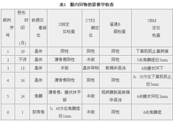 1997年4月至6月经UBM定位检查诊断为球内异物6例(6只眼)均为铁屑击伤,其中2例当时取异物失败;1例两年后出现角膜铁锈沉着症,眼球早期萎缩;另1例伤后1个月来就诊,房角镜下可见房角铁锈沉着;另外4例伤时未发现异物,在一年半到三年后因晶体铁锈沉着症而就诊。