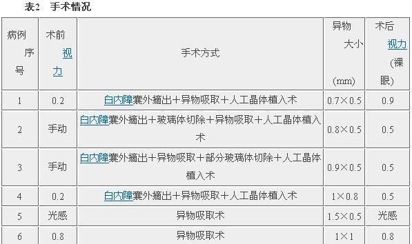 2.2 手术方法 根据UBM定位,做板层巩膜瓣,行磁石试验。阳性者切穿后板层巩膜及色素膜吸出异物;阴性者行白内障囊外摘出术后,用间接检眼镜或在手术显微镜下用眼内导光进一步查找异物。再在巩膜表面定位,切穿后板层巩膜及葡萄膜后吸出异物。玻璃体混浊者同时行玻璃体切除术,眼底正常者行人工晶体植入术。