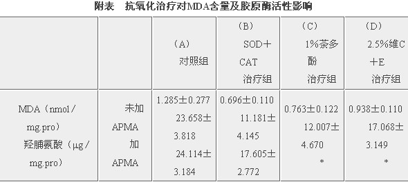 2.1 抗氧化治疗对丙二醛(MDA)含量及胶原酶活性影响