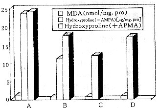 经不同的抗氧化剂治疗后各组角膜组织中MDA的含量及胶原酶活性均显著低于未治疗组(p<0.05);MDA含量与胶原酶活性呈正相关,相关系数r=0.9956,p=0.0044。各治疗组间,B组与C组间无显著性差异(p>0.05),而D组的MDA含量及胶原酶活性则均显著高于B、C组(p<0.05)。对照组羟脯氨酸(Hydro-xyproline) 含量在加APMA与未加APMA比较,无明显差异(p>0.05);而B组加入APMA(4-乙酸氨基苯汞,胶原酶潜酶活化)后羟脯氨酸含量显著高于未加APMA(p<0.05),但仍显著低于对照组(p<0.05)。(见附表及图1,2)。