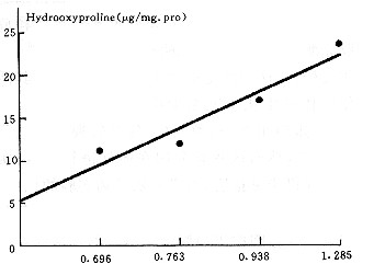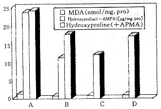 经不同的抗氧化剂治疗后各组角膜组织中MDA的含量及胶原酶活性均显著低于未治疗组(p<0.05);MDA含量与胶原酶活性呈正相关,相关系数r=0.9956,p=0.0044。各治疗组间,B组与C组间无显著性差异(p>0.05),而D组的MDA含量及胶原酶活性则均显著高于B、C组(p<0.05)。对照组羟脯氨酸(Hydro-xyproline) 含量在加APMA与未加APMA比较,无明显差异(p>0.05);而B组加入APMA(4-乙酸氨基苯汞,胶原酶潜酶活化)后羟脯氨酸含量显著高于未加APMA(p<0.05),但仍显著低于对照组(p<0.05)。(见附表及图1,2)。
