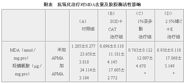 2.1 抗氧化治疗对丙二醛(MDA)含量及胶原酶活性影响