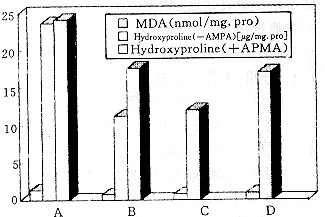经不同的抗氧化剂治疗后各组角膜组织中MDA的含量及胶原酶活性均显著低于未治疗组(p<0.05);MDA含量与胶原酶活性呈正相关,相关系数r=0.9956,p=0.0044。各治疗组间,B组与C组间无显著性差异(p>0.05),而D组的MDA含量及胶原酶活性则均显著高于B、C组(p<0.05)。对照组羟脯氨酸(Hydro-xyproline) 含量在加APMA与未加APMA比较,无明显差异(p>0.05);而B组加入APMA(4-乙酸氨基苯汞,胶原酶潜酶活化)后羟脯氨酸含量显著高于未加APMA(p<0.05),但仍显著低于对照组(p<0.05)。(见附表及图1,2)。