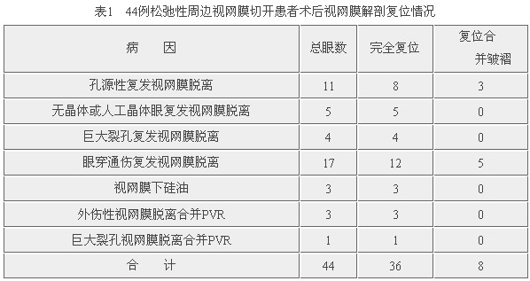 44例患者在视网膜切开术后的视网膜解剖复位情况见表1。 .