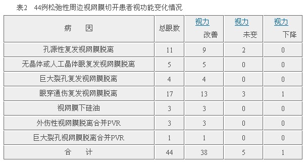 2.再次修复手术:44只眼中,有4只眼进行了再次手术修复。其中2只眼视网膜切除范围为180°,1只眼为310°,另1只眼为330°,术后4只眼均于残存的周边视网膜部发生新的增殖牵引,导致周边部存留的视网膜再度脱离。再次修复手术中,切除了全部残存的周边视网膜,使视网膜完全复位。视网膜切开术后,视网膜切除缘部可能发生再增殖,因此术中应将切除缘前部的视网膜尽量清除。为减少再增殖反应,术后局部使用激素的时间也应长于普通玻璃体切除、硅油填充术。