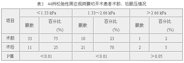 44只眼行松弛性周边视网膜切开术后,有22只眼取出了硅油,其中21只眼视网膜保持复位,1只眼在硅油取出后4个月发生了视网膜再脱离,经重新进行视网膜复位合并硅油填充术,恢复了视力。22只眼硅油取出后,眼压<1.33 kPa者8只眼,1.33~2.66 kPa者13只眼,>2.66 kPa者1只眼。22只眼硅油取出后视力情况:≥0.1者8只眼,0.09~0.02者11只眼,<0.02者3只眼。