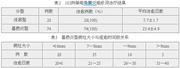 浅层型在一周左右治愈,而基质炎型则浸润范围与治愈时间呈明显的正相关(表2、3)。