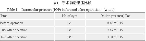 结果 36例36眼术后3mo平均矫正视力0.1~0.4者9眼,0.5~0.8者18眼,1.0以上者9眼,≥0.5的占75%.而术后眼压都得到控制(平均为2.51kPa),与术前比较有显著差异(P<0.01)。术后无影响视力的远期并发症。