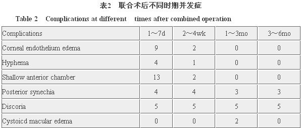 术后近期并发症如角膜内皮混浊、前房积血、浅前房经治疗后在2~4wk内消失。而黄斑囊样水肿则在3mo以内消失,虹膜后粘连与瞳孔变形未能治愈,但均未影响视力。