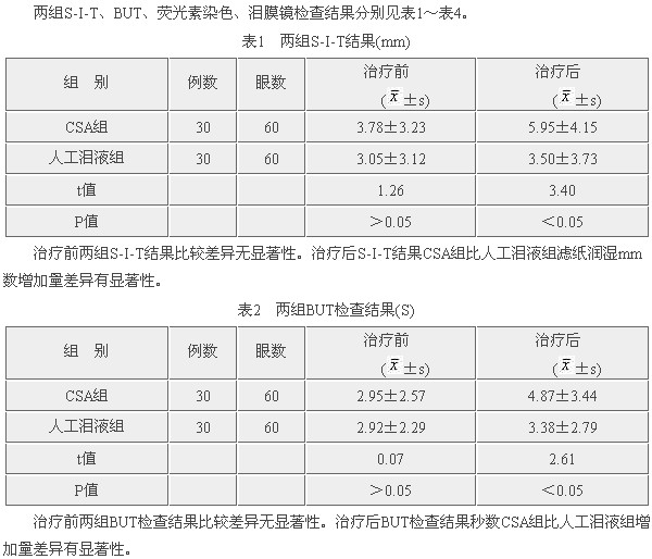 本研究与以上研究结果一致,进一步证明CSA局部应用治疗干眼症确实有效。CSA组与人工泪液组治疗前S-I-T、BUT、荧光素染色、泪膜镜检查等级经t检验均P>0.05。治疗后S-I-T、BUT经t检验均P<0.05。两组治疗前后荧光素染色、泪膜镜检查等级经χ2检验P<0.01,表明CSA组治疗后泪液量较治疗前明显增加。CSA组临床症状基本消失或减轻23例,有效率76.66%,人工泪液组症状基本消失或减轻13例,有效率43.33%,经统计学处理差异有显著性。。CSA组中SS患者治疗后多数人检查结果较治疗前有改善,非SS患者治疗后检查结果较治疗前多无改善。显示CSA局部应用对SS患者更有效。近年研究〔10〕发现CSA除具有高效的免疫抑制作用外,还具有抗增殖作用。通过抑制炎症细胞和细胞因子的产生,从而抑制成纤维细胞的活化。我们推测CSA对SS之所以有效,一方面其抑制了泪腺中淋巴细胞的浸润,减少了炎症反应;另一方面抑制了泪腺组织的瘢痕化。CSA全身应用毒副作用很大,局部应用因吸收甚微,故可避免其副作用。关于CSA局部应用的最佳剂量的报道很少。动物实验报道多为1%~2%,每日5次;临床应用药物浓度多为2%,患者常有眼红、痒、流泪或烧灼感,未见引起眼压高、白内障或视网膜疾病的报道。CSA为脂溶剂,干眼症患者由于缺乏泪液,对于高浓度的非水溶性滴眼剂会产生强烈的刺激感,我们曾将2%CSA用于干眼症患者,患者刺激感强烈,不能耐受。应用0.5%CSA滴眼剂多数患者都能较好的耐受。仅有两例患者眼部出现过敏现象,可能由于药物溶剂所致。
