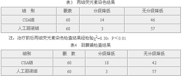 注:治疗前后两组泪膜镜检查结果经检验χ2=12.99,P<0.01 CSA组临床症状基本消失或减轻23例,有效率76.66%,人工泪液组症状基本消失或减轻13例,有效率43.33%。有效率比较,χ2=6.94,P<0.01。