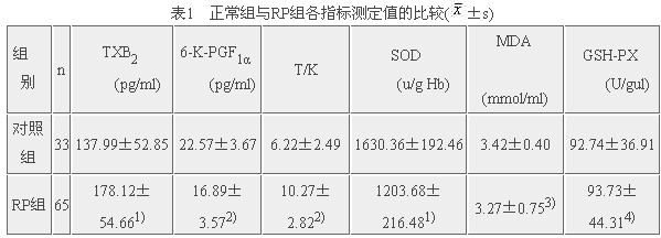 2.1 正常组与RP组各指标测定值的比较(见表1)