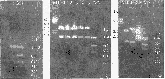 2.1 PCR扩增的结果和鉴定 取8 μl PCR产物在2%琼脂糖凝胶电泳,以PCR分子量标准为参照(图1),大约于1.5 kb处有一条DNA条带,与预期的长度(1 555 bp)相符。