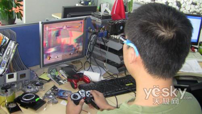 上面图片就是玩家正在用3D眼镜体验最新游戏《街霸4》。开启3D视觉效果的普通屏幕,看上去人影憧憧。不过玩家戴的眼镜并非来自NVIDIA,而是来自影驰。