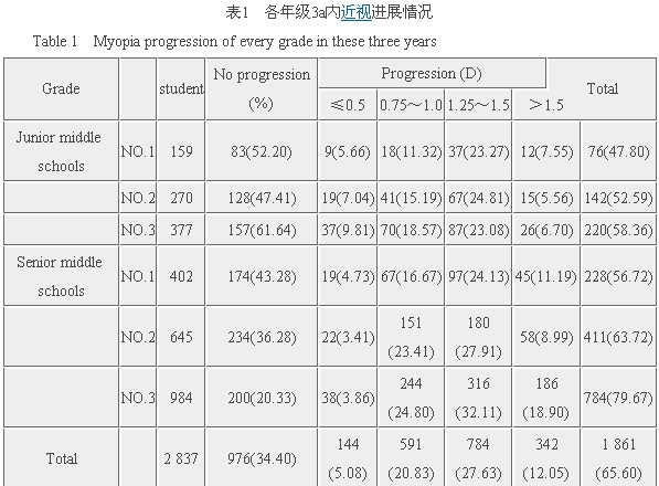 2 837名中学生3a内近视进展的共有1 861人,占65.60%,具体情况见表1。