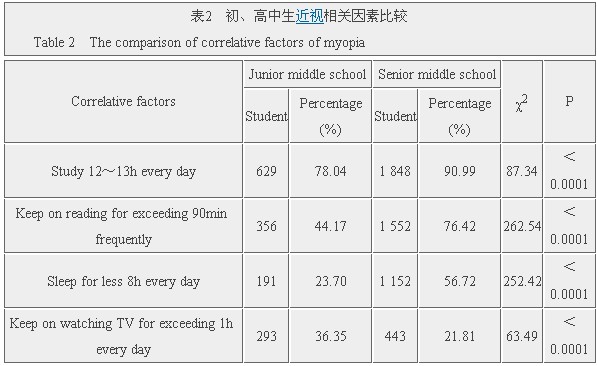 在几种主要相关因素中,初、高中生中存在着非常显著性差异,见表2。