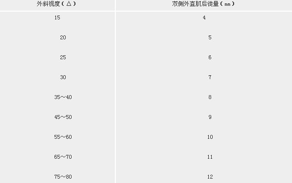 1.3 手术定量及方法 ①手术 定量:以戴镜看远的斜视角作为手术定量标准,参照有关文献[1、2、3],本组 病例的双侧外直肌后徙手术量按表1计算。②手术方法:65例中,9例不合作的儿童在全 麻下手术,其他56例在局麻下手术,均由同1名医师施术。做角膜缘球结膜切口,用斜视 钩勾出外直肌,充分松解节制韧带及肌间膜,用ETHICON6-0可吸收缝线作近肌肉 止端的双臂套环缝线。沿肌止端剪断外直肌,用两脚规从肌止端沿肌肉走行向后测量并做标 记,将铲形针向前呈45°角穿过标记处的浅层巩膜,先打一双绕线结,然后用两脚规再次 测 量,必要时适当调整缝线。对外直肌后徙量>10mm者采用部分悬吊缝合法。连续缝合球 结膜切口。
