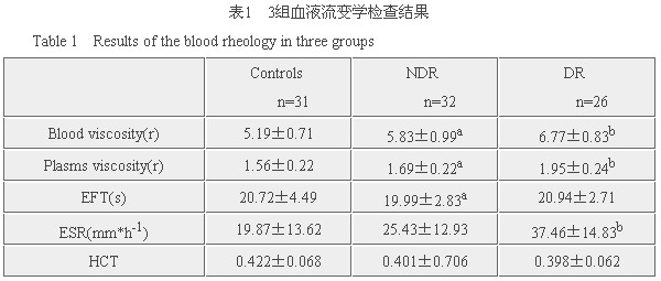 3组血液流变学检测结果见表1。非DR组与对照组5项指标相比均无显著性差异。DR组全血粘度、血浆粘度和血沉均显著高于对照组和非DR组(P<0.01)。