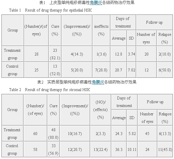 上皮型和实质层型各组都出现以下相同结果:(1)治疗组治愈率和有效率都明显高于对照组;(2)平均治愈天数治疗组明显少于对照组;(3)对治愈后的大部分患者随访14~24mo;平均18.9mo,统计复发率,治疗组明显低于对照组。上述三者经χ2检验均有非常显著性差异(P<0.01)。见表1、2。