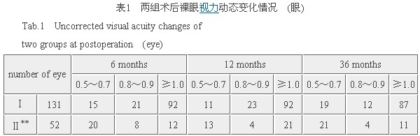 2.1 术后视力 术后裸眼视力于术后1~6个月波动较大,6个月后渐趋稳定,见表1、表2。
