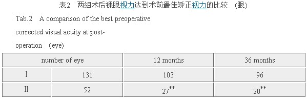 与第Ⅰ组比较:** P<0.01 两组6个月、12个月、36个月时视力恢复到0.5、0.8、1.0的百分率的比较,经等级分组资料的秩和检验,P均<0.01,差异有非常显著性意义。