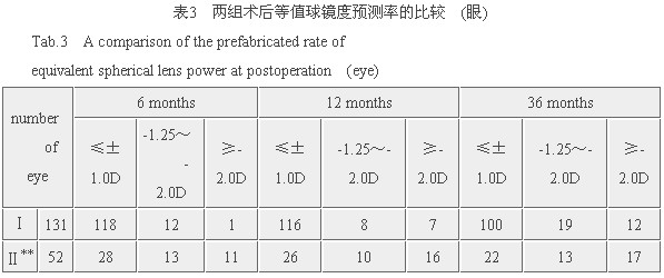 2.2 屈光度 术后10天和1个月复查时,有少部分患者出现+0.50~+1.00D的过矫,术后3个月后,所有患者均未出现过矫,术后屈光度变化见表3,两组回退的最高度数为-4.25D。